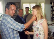 Tödlicher EinbruchRobert Seifert (Thomas Dannemann, li.) spielt den Beamten Kehler (Wolfgang Bathke, hi.li.) und Bonhoff (Wolfgang Krewe) mit seiner Frau Ellen (Katja Studt) heile Welt vor.Bild: © MG RTL D / Rolf Baumgartne