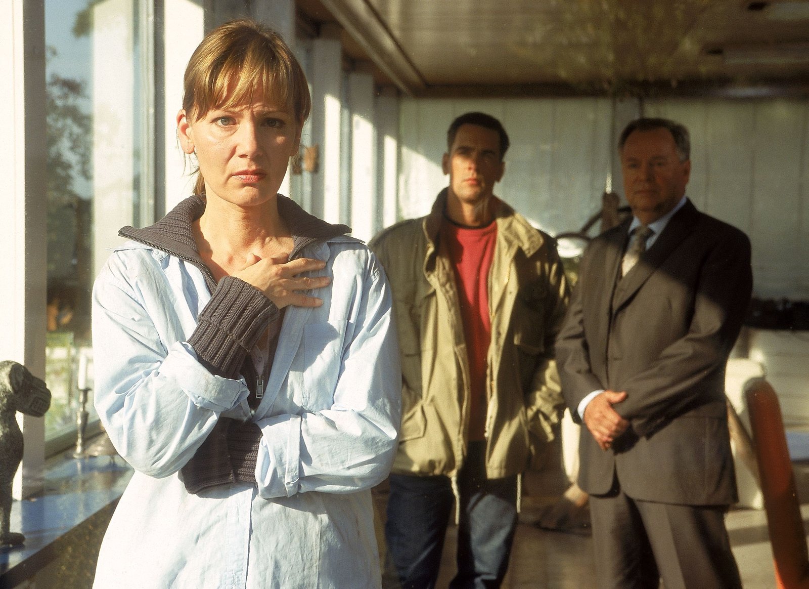 Der Tote am SeeDie Beamten Bonhoff (Wolfgang Krewe, Mi.) und Kehler (Wolfgang Bathke) befragen Vera Thieme (Antje Schmidt) über ihre finanzielle Situation. Warum wurde ihr Mann umgebracht?Bild: © MG RTL D / Rolf Baumgartne
