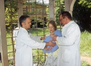 Franziskas GeheimnisIm Garten des neurologischen Pflegeheims wird die Patientin Franziska Spartmann (Komparsin, lieg.) gefunden. Schwester Karin (Christina Greb) kommt jedoch zu spät - das Mädchen ist tot (li. und re. Komparsen).Bild: © RTLplus