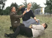 Freitag der 13.KHK Kehler (Wolfgang Bathke, li.) und der zu Boden gegangene KK Bongartz (Max Gertsch, lieg.) versuchen Milzarek (Michael Schenk) festzunehmen, doch der wehrt sich schlagkräftig.Bild: © RTLplus