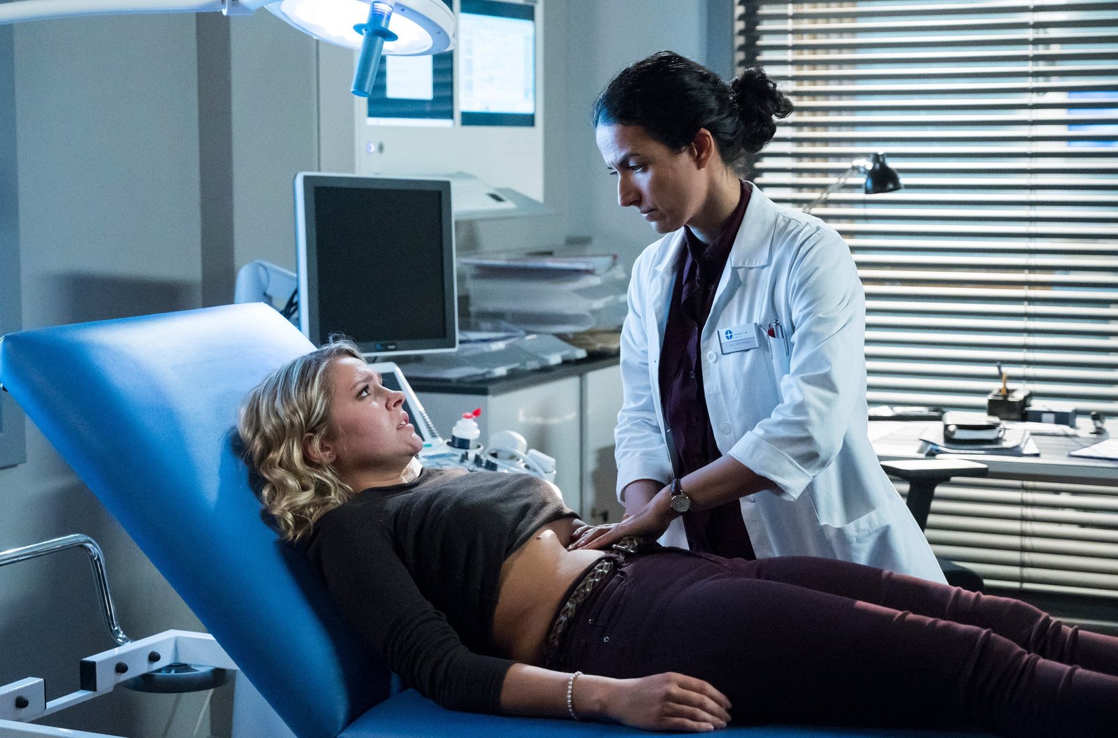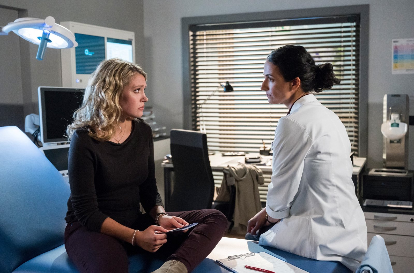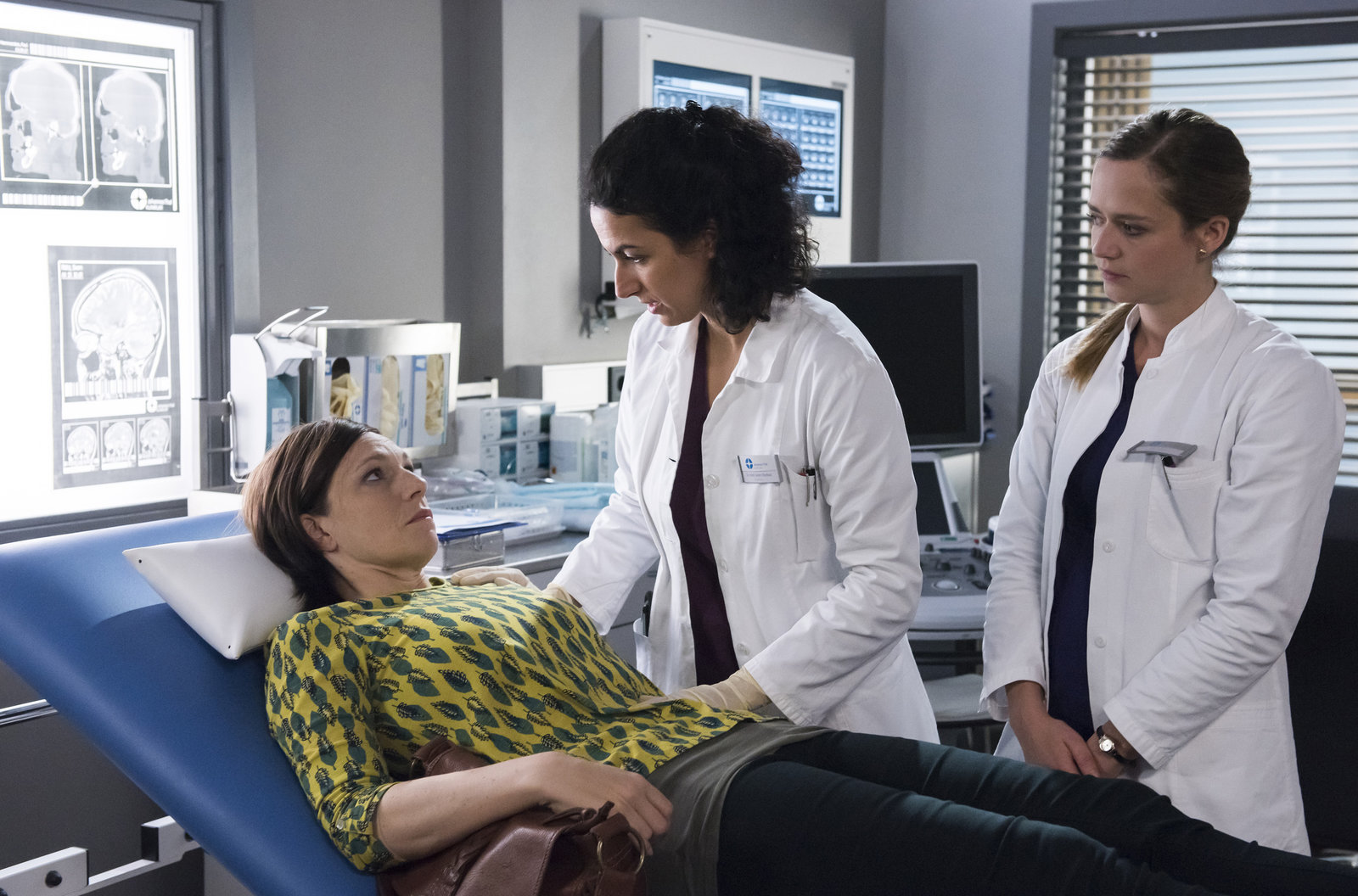 NotlösungenPia Krämer (Charleen Deetz, l.) ist eigentlich wegen ihrer Schwester im Klinikum. Aber auch ihr geht es nicht gut. Dr. Leyla Sherbaz (Sanam Afrashteh, r.) ahnt unter welchem Druck die junge Frau steht.Bild: © MDR/ARD/Jens Ulrich Koch