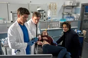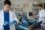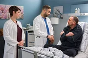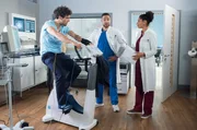 Aus LiebeNach einem Treppensturz kommt Axel Becker (Jens Kipper, M.) in die Notaufnahme. Matteo (Mike Adler, r.) und Ben (Philipp Danne, l.) hatten den Patienten für eine Nierentransplantation vorgesehen. Doch durch den Sturz verschiebt sich der ganze Zeitplan.Bild: © ARD/Jens Ulrich Koch