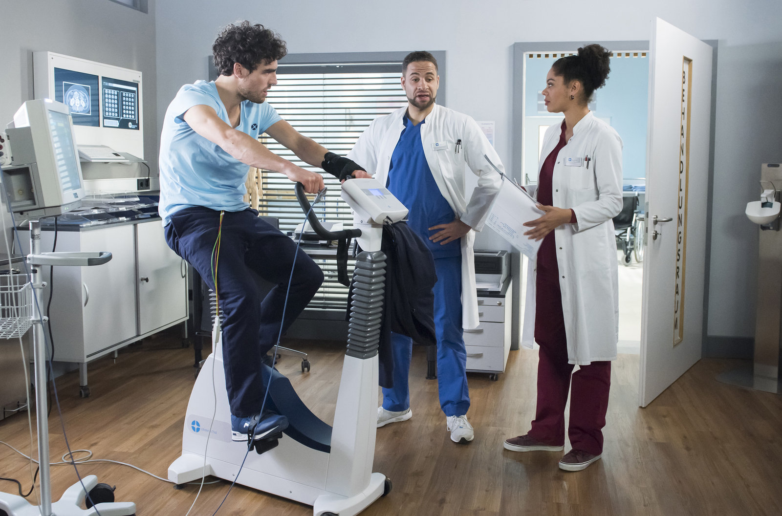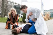 BerufungSENDER: ARD - SENDETITEL: In aller Freundschaft - Die jungen Ärzte Folge 161 - UNTERTITEL: Berufung - CAPTION: ARD IN ALLER FREUNDSCHAFT - DIE JUNGEN ÄRZTE FOLGE 161, "Berufung", am Donnerstag (25.10.18) um 18:50 Uhr im ERSTEN..Als der Rettungswagen mit Elias (Stefan Ruppe, h.M.) eintrifft, haben Jasmin Hatem (Leslie-Vanessa Lill, l.) und Louisa Neukamm (Llewellyn Reichman, r. mit Komparse) schon erfolgreich erste Hilfe geleistet. So dass sie den Patienten Norman Schlüter (Peter Sikorski, v.M.) sofort ins Johannes-Thal-Klinikum bringen können..© ARD/Jens-Ulrich Koch, honorarfrei - Verwendung gemäß der AGB im engen inhaltlichen, redaktionellen Zusammenhang mit genannter ARD-Sendung bei Nennung "Bild: ARD/Jens-Ulrich Koch" (S2+). ARD-Programmdirektion/Bildredaktion, Tel: 089/5900-23534, Fax: 089/550-1259, bildredaktion@DasErste.deBild: © ARD/Jens-Ulrich Koch