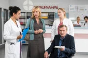 Wer wagt, gewinntEin skurriler Fall bahnt sich für Dr. Sherbaz (Sanam Afrashteh, l.) und Julia Berger (Mirka Pigulla, 2.v.r. mit Komparsen h.) an: Holger Meyer (Jörg Bundschuh, r.) wird von seiner Frau Simone (Katharina Abt, 2.v.l.) in die Notaufnahme gebracht. Denn Holger hat aus Trotz einen Schlüssel verschluckt!Bild: © ARD/Jens Ulrich Koch