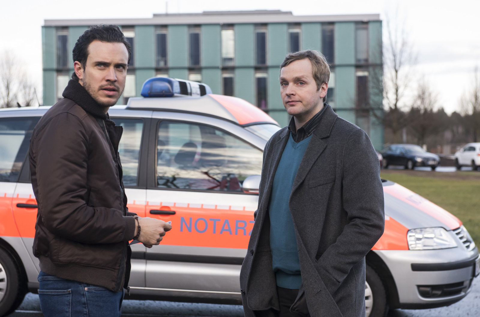 Versteckte WundenNiklas (Roy Peter Link, l.) übergibt Ben (Philipp Danne, r.) die Befunde von Herrn Garowski - die Diagnose macht beide betroffen.Bild: © ARD/Jens Ulrich Koch