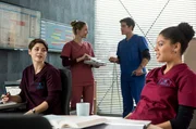 UnentbehrlichLine Seibert hat sich mit dem Leistenbruch verhoben - nun kann die OP doch nicht mehr warten. V.l.n.r. Line Seibert (Charlotte Bohning), Dr. Leyla Sherbaz (Sanam Afrashteh), Eva Ludwig (Sarina Radomski).Bild: © ARD/Jens Ulrich Koch