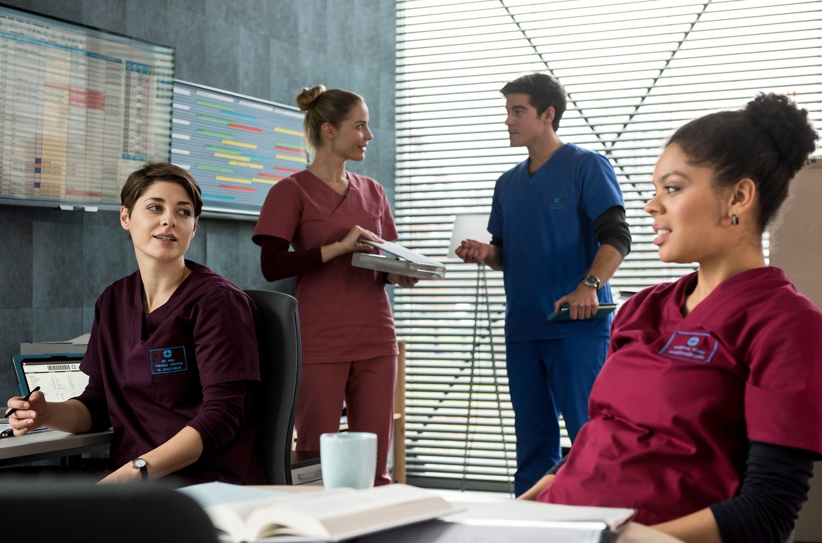 Blinder FleckDie jungen Ärzte Dr. Theresa Koshka (Katharina Nesytowa, l.), Julia Berger (Mirka Pigulla, 2.v.l.), Ben Ahlbeck (Philipp Danne, 2.v.r.) und Vivienne Kling (Jane Chirwa, r.) diskutieren über Julias Befund im Fall Jacobs.Bild: © ARD/Jens Ulrich Koch