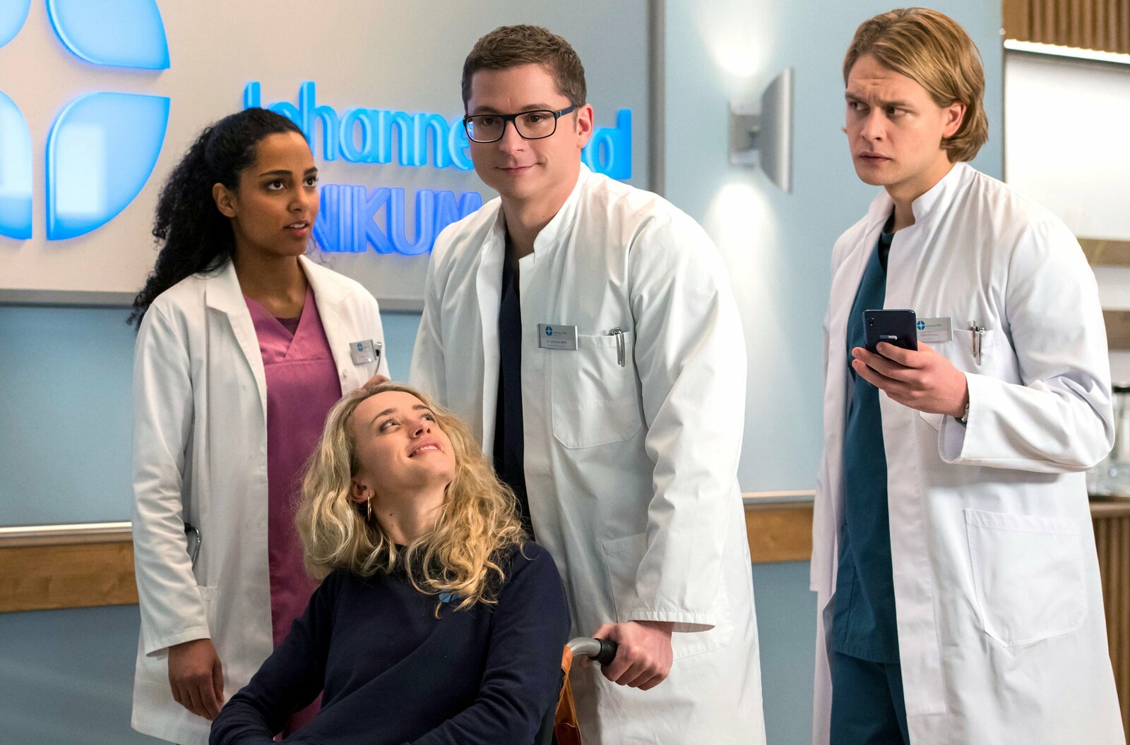 Geplatzte TräumeDr. Elias Bähr (Stefan Ruppe, 2.v.r.) bringt Helmi (Runa Schymanski, 2.v.l.) zum MRT. Mikko (Luan Gummich, r.) und Emma (Elisa Agbaglah, l.) fällt auf, dass die beiden die gemeinsame Zeit zu genießen scheinen.Bild: © ARD/Jens Ulrich Koch