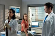 TrennungDie junge Patientin Nina Unterdörfer (Franziska Benz, M.) kommt mit einer chronischen Krankheit ins Klinikum.Oberärztin Leyla Sherbaz (Sanam Afrashteh, l.) und Assistenzarzt Ben Ahlbeck (Philipp Danne, r.) schauen besorgt auf die Untersuchungsergebnisse.Bild: © ARD/Jens Ulrich Koch