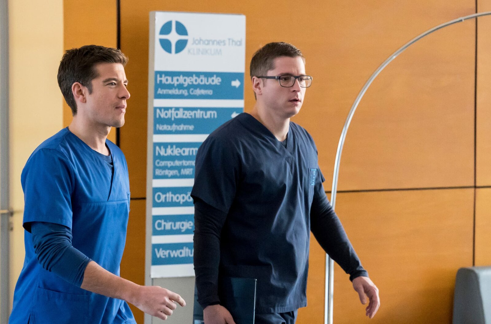 BeziehungenMikko Rantala (Luan Gummich, l.) ist genervt von Matteos (Mike Adler, r.) ganz eigener Methode, die jungen Ärzte zu fördern und fordern.Bild: © ARD/Jens Ulrich Koch