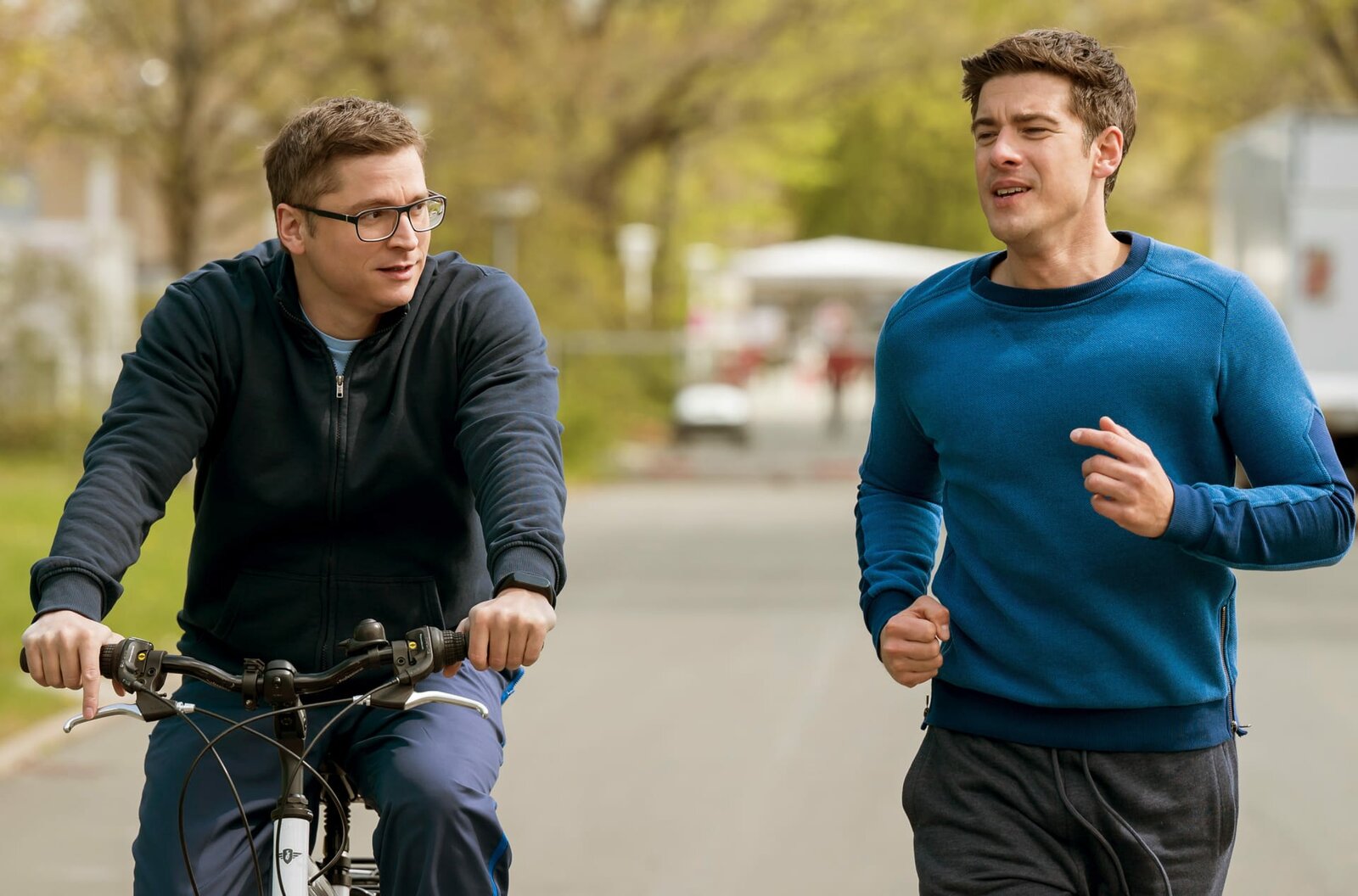 Ben Ahlbeck (Philipp Danne, l.) und Elias Bähr (Stefan Ruppe, r.) trainieren für den bevorstehenden Firmenlauf.Bild: © ARD/Jens Ulrich Koch