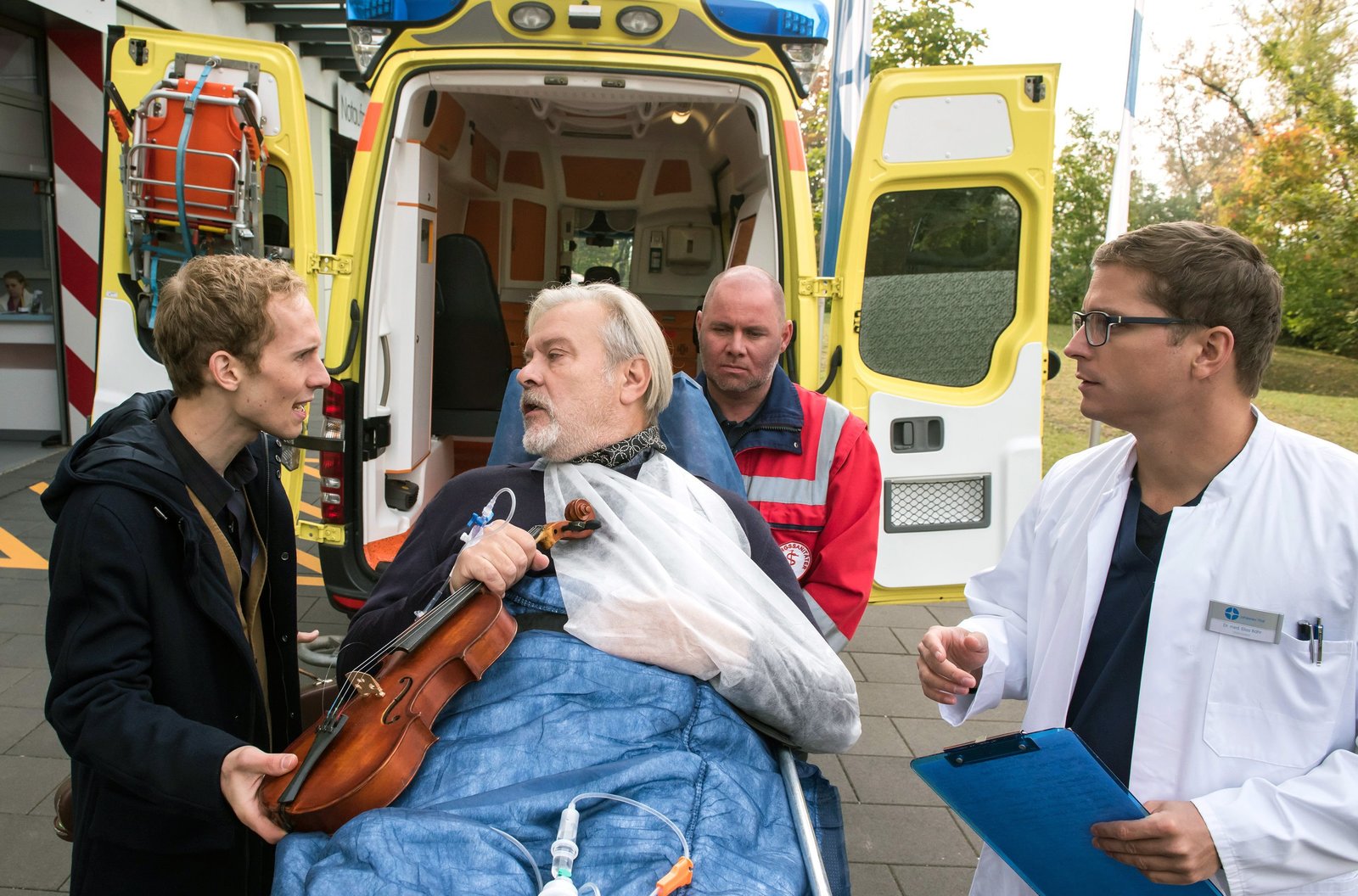 Mit letzter KraftDr. Elias Bähr (Stefan Ruppe, r.) nimmt den Instrumentenbauer Hartmut Hoffmann (Andreas Leupold, M. mit Komparse, h.) im Johannes-Thal-Klinikum auf. Er ist in Begleitung seines Sohnes Lenny (Manuel Zschunke, l.).Bild: © ARD/Jens Ulrich Koch