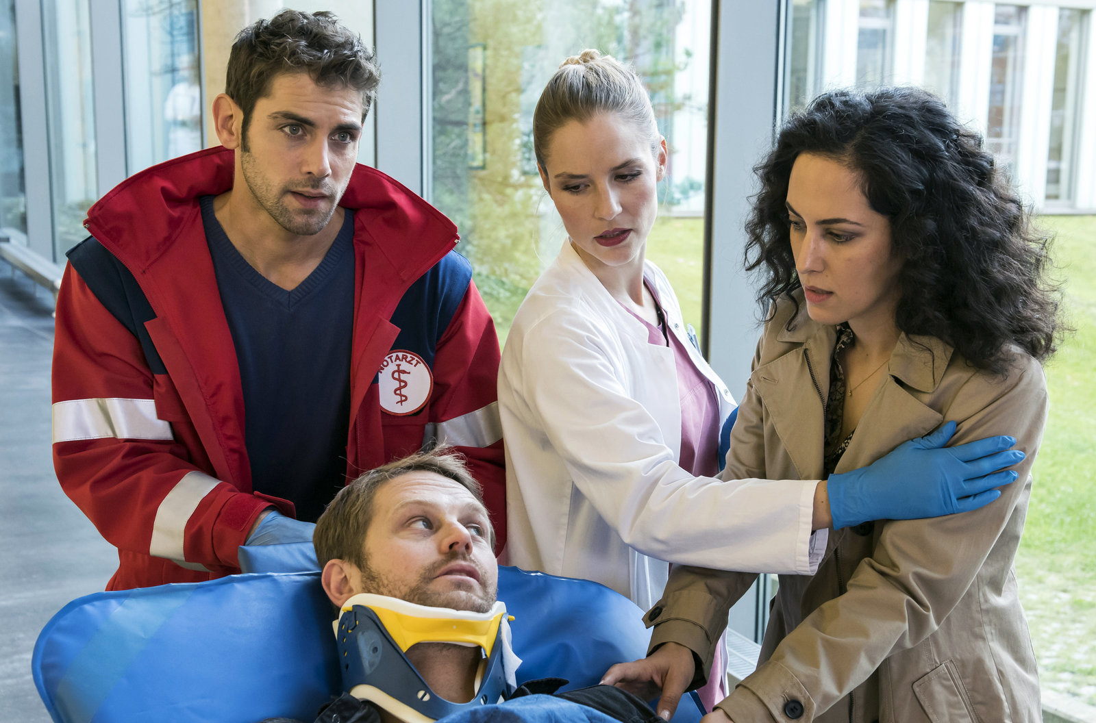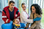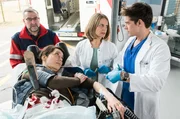 AusweichmanöverRaik Hoffmann (Tim Ehlert, v.M.), wurde nach einem Sturz vom Hochspannungsmast sofort ins JTK gebracht; seine Frau Linda (Damineh Hojat, r.) will ihm beistehen. Dr. Niklas Ahrend (Roy Peter Link, l.) und Julia Berger (Mirka Pigulla, 2.v.r.) müssen den Verletzten sofort zur Untersuchung bringen.Bild: © ARD/Jens Ulrich Koch