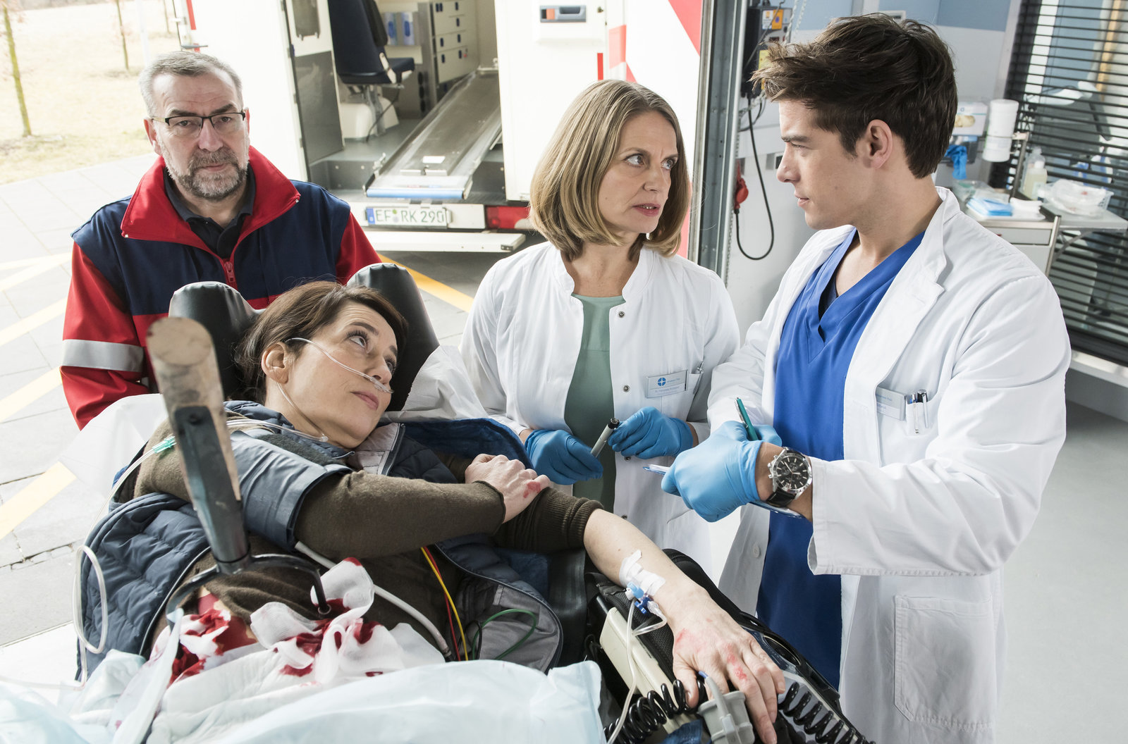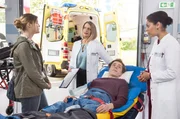 Frauen von früherDie Patientin Iris von Herder (Jele Brückner, l. mit Komparse, h.) wird nach einem Reitunfall ins Johannes-Thal-Klinikum eingeliefert. Ben Ahlbeck (Philipp Danne, r.) und Dr. Ruhland (Gunda Ebert, 2.v.r.) übernehmen die Erstuntersuchung.Bild: © ARD/Jens Ulrich Koch