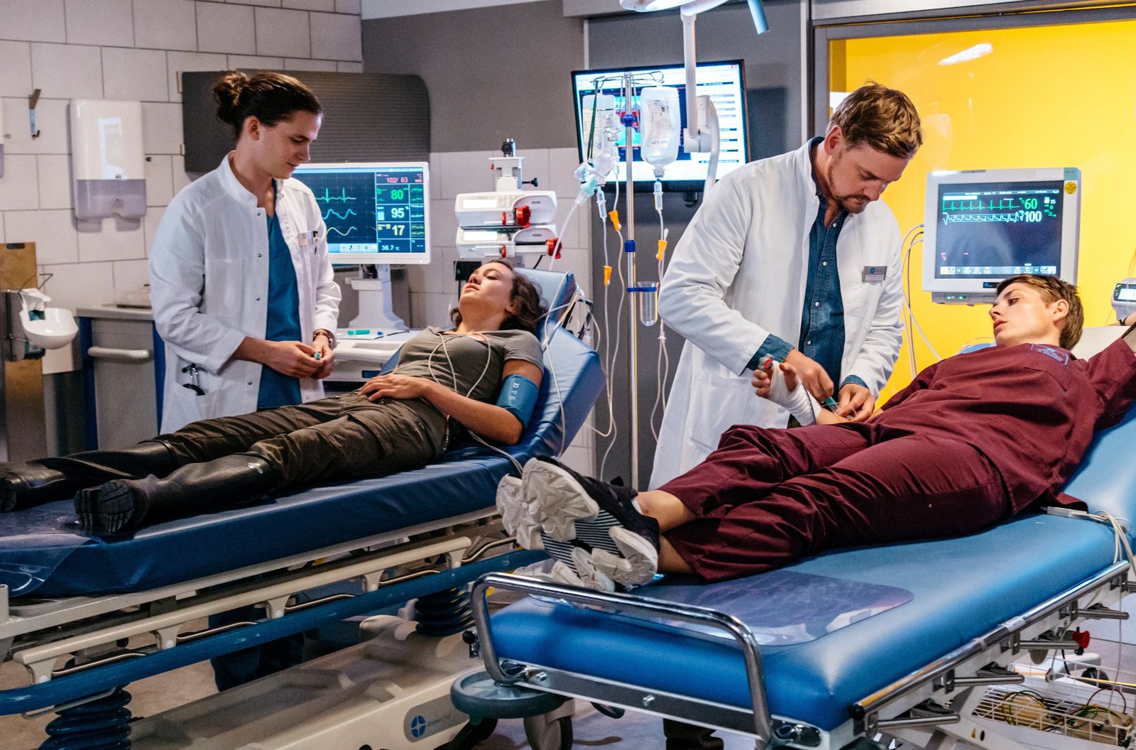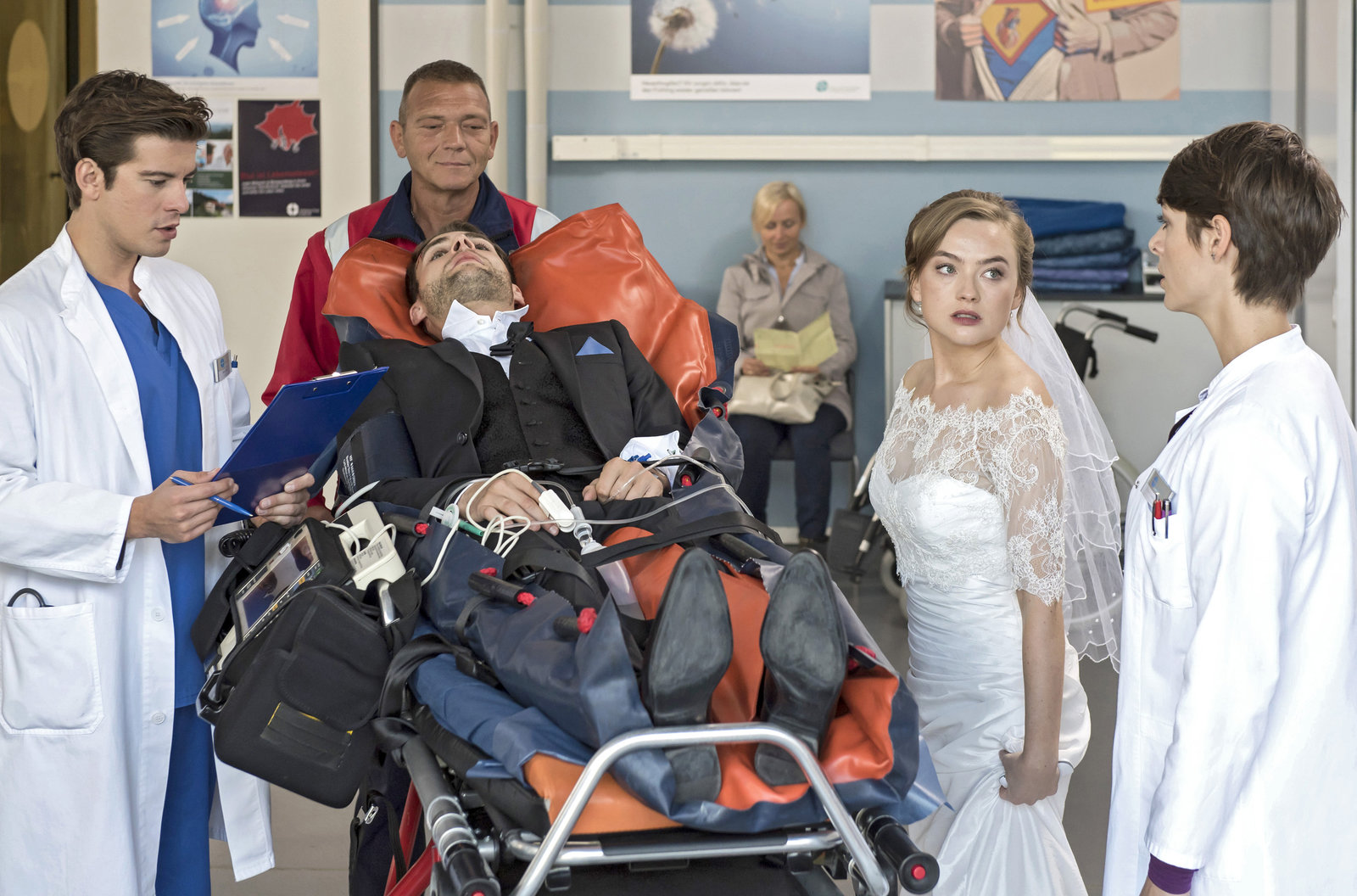 ErwartungenInga Lanz (Kyra Sophia Kahre, 2.v.r.) und Michael Martin (Daniel Fritz, v.M. mit Komparsen, h.M.) kommen aufgewühlt in der Notaufnahme an: Eigentlich wollten die beiden heute heiraten, doch der angehende Bräutigam wurde angefahren – von niemand anderem als der Braut. Ben Ahlbeck (Philipp Danne, l.) und Dr. Theresa Koshka (Katharina Nesytowa, r.) kümmern sich um die beiden.Bild: © ARD/Jens Ulrich Koch