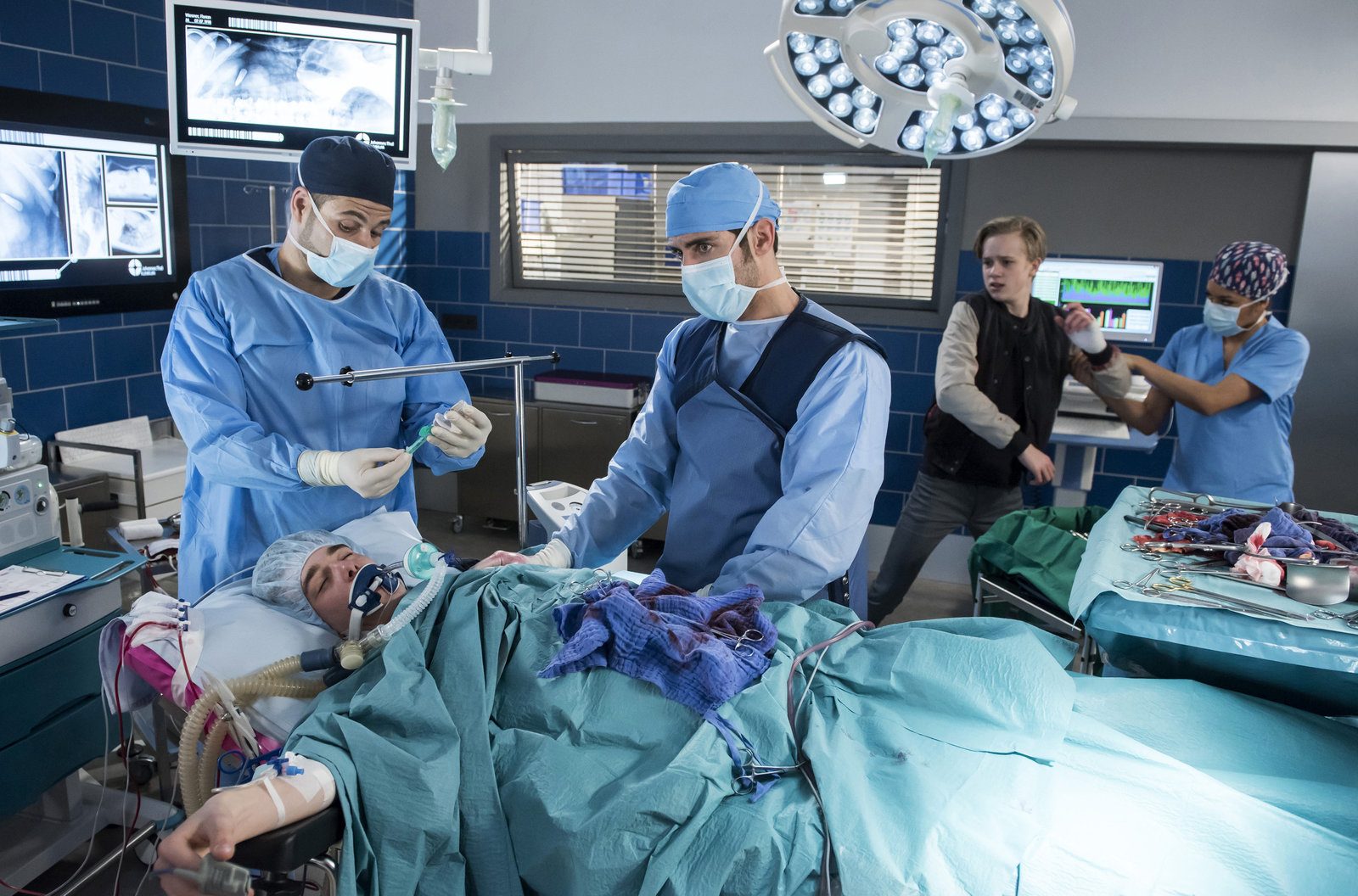 FamilienbandeArthur Westermann wird operiert. Der Trecking-Stock, von dem er aufgespießt wurde, muss entfernt werden. Dr. Koshka darf die Anästhesie übernehmen. v.l.n.r. Dr. Theresa Koshka (Katharina Nesytowa), Arthur Westermann (Benedikt Blaskovic), Komparsin, Dr. Matteo Moreau (Mike Adler).Bild: © MDR/Jens Ulrich Koch