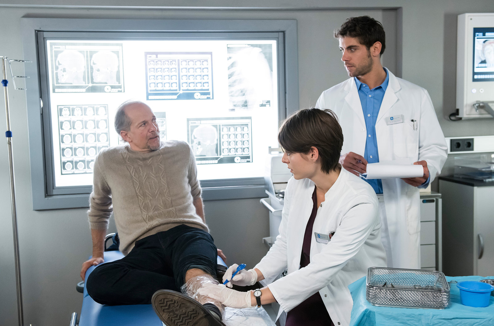 Carpe DiemDr. Theresa Koshka (Katharina Nesytowa, M.) versorgt den Abszess. Dabei kommen sie und Dr. Niklas Ahrend (Roy Peter Link, r.) mit dem Seefahrer Christian Heine (Jochen Horst, l.) ins Gespräch.Bild: © ARD/Jens Ulrich Koch