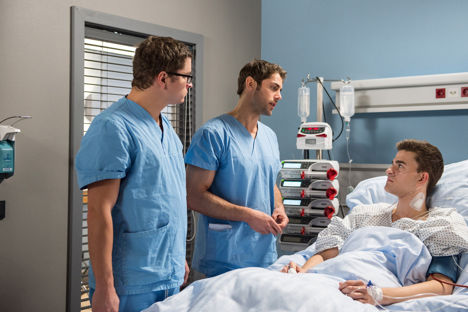 KlartextEine wahre Legende kommt ans Johannes-Thal-Klinikum: Motorcross-Fahrer Martin Klausen (Markus Knüfken, l.) begleitet seinen Sohn Philipp (Lukas Till Berglund, v.M.), der nach einem Motorcross Unfall dringend ärztlich versorgt werden muss. Dr. Niklas Ahrend (Roy Peter Link, h.M.) und Ben Ahlbeck (Philipp Danne, r.) kümmern sich im den jungen Patienten.Bild: © ARD/Jens Ulrich Koch