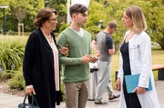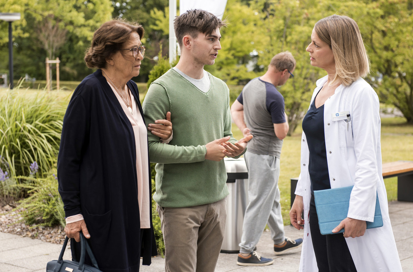 Hab keine AngstBesorgt bringt Joshua Alvart (Vincent zur Linden, M.) seine Oma Lene (Tatja Seibt, l.), ins Johannes-Thal-Klinikum. Die Neurochirurgin Dr. Ruhland (Gunda Ebert, r.) reagiert sofort: Sie erkennt, wie schwer krank Frau Alvart ist.Bild: © ARD/Jens Ulrich Koch