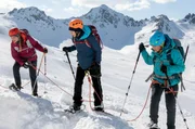 Ganz in WeißDie Seilschaft stoppt an einer Gletscherspalte. Sie hören Gregors Stimme. V.l.n.r. Julia Berger (Mirka Pigulla), Elisabeth Blanz (Gabriela Lindl) und die Bergführerin Maria Dengler (Cosima Lehninger).Bild: © ARD/Stefanie Leo