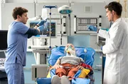 VerantwortungHella Kurtschik (Louise Sophie Arnold, M.) ist bei einem Krampfanfall die Treppe heruntergestürzt. Ben Ahlbeck (Philipp Danne, r.) und Florian Osterwald (Lion Wasczyk, l.) müssen schnell handeln, denn die Patientin droht an ihrem Zungenpiercing zu ersticken.Bild: © ARD/Jens-Ulrich Koch