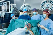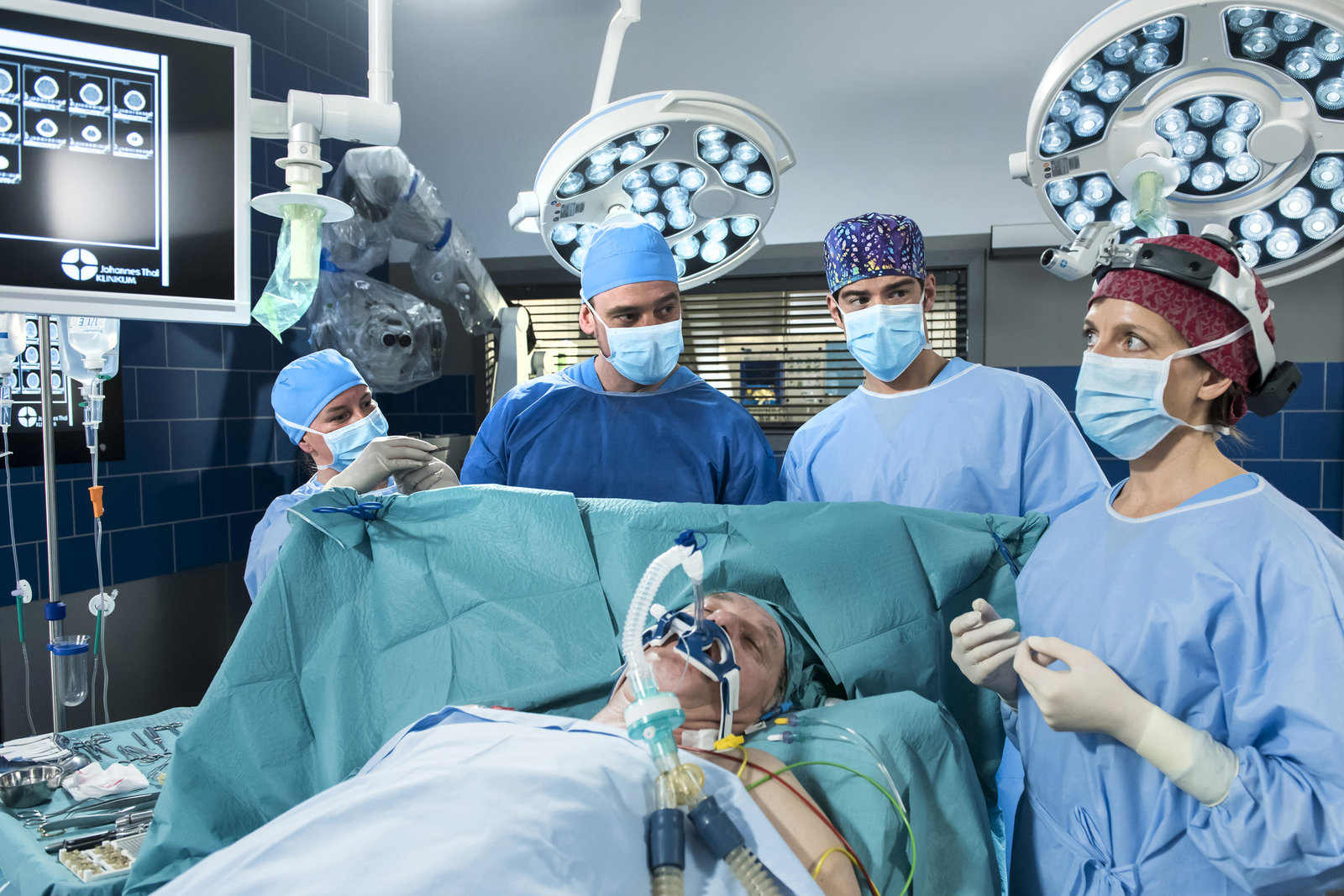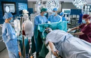 TabuInes Czerny (Anais Dahl, r.) hat sich die Hand verletzt. Florian Osterwald (Lion Wasczyk, 2.v.l.) und Dr. Ben Ahlbeck (Philipp Danne, 3.v.l.) müssen operieren (mit Kompars:innen).Bild: © ARD/Jens-Ulrich Koch
