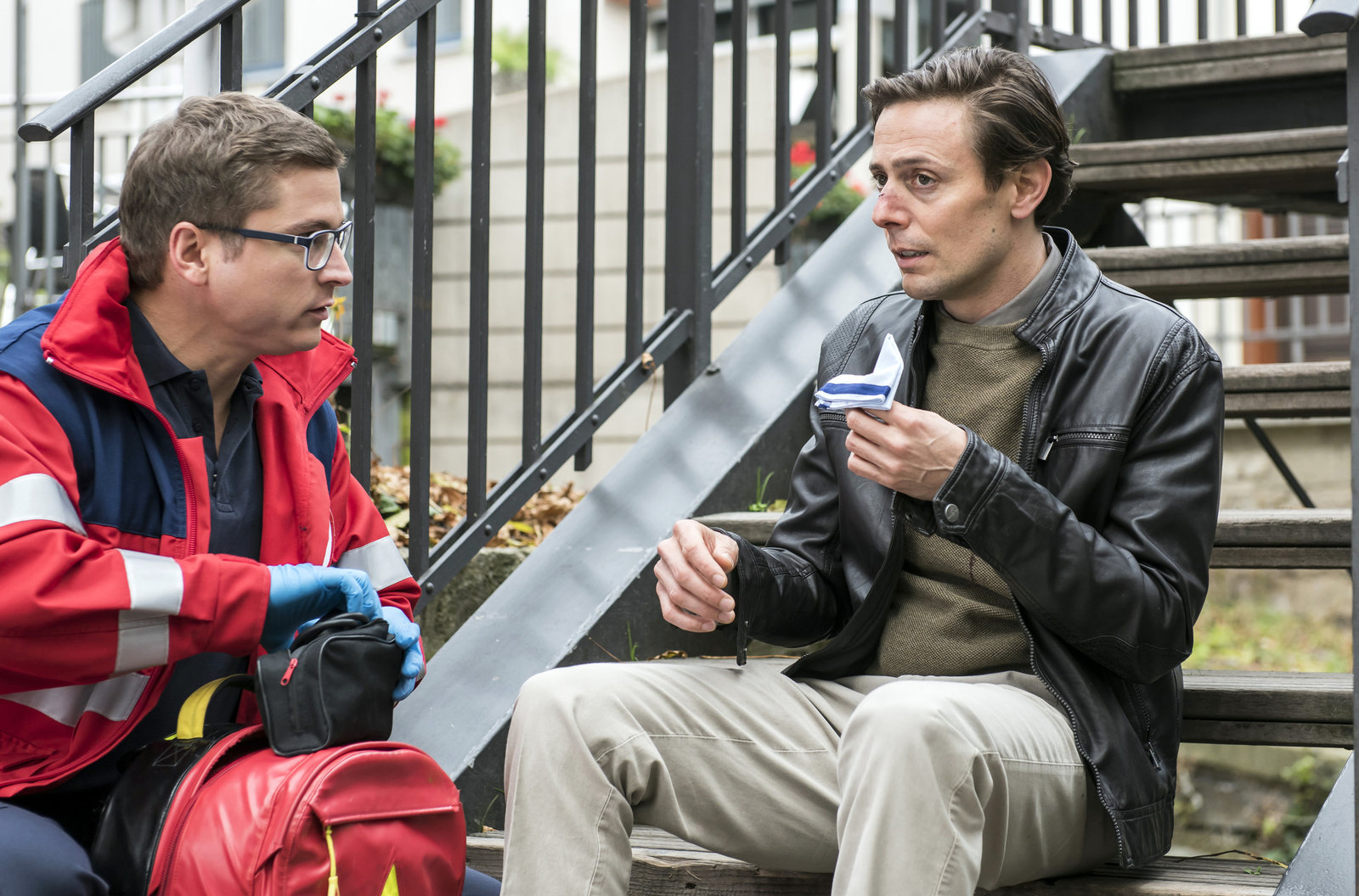 GlücksspielElias (Stefan Ruppe, l.) hört erstaunt und entsetzt zugleich, was ihm Justus Schmidt (Roland Bonjour, r.) über den Unfallhergang berichtet.Bild: © ARD/Jens Ulrich Koch / ARD-Programmdirektion