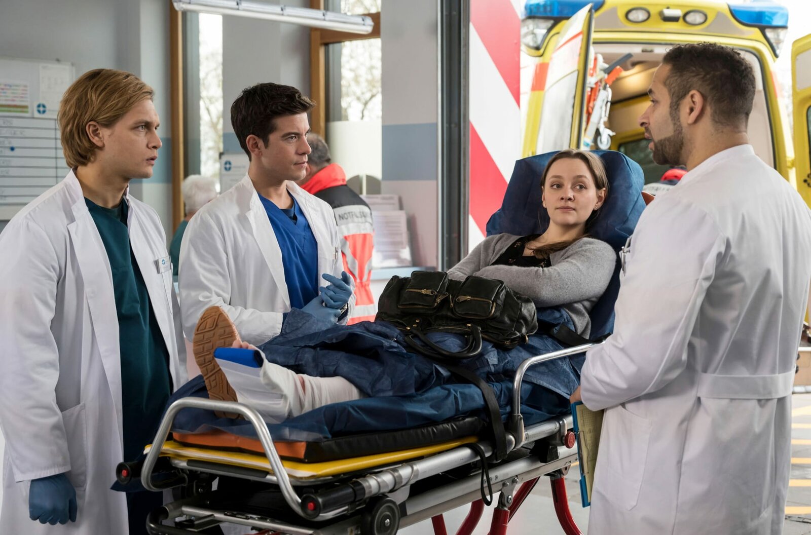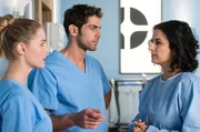RückschlägeSarah Hahn – ein bekanntes Gesicht im Johannes-Thal-Klinikum – kommt mit schweren Vorwürfen gegen Dr. Moreau in die Notaufnahme. V.l.n.r. Mikko Rantala (Luan Gummich), Ben Ahlbeck (Philipp Danne), Sarah Hahn (Mathilde Bundschuh), Matteo Moreau (Mike Adler).Bild: © NDR/ARD/Jens Ulrich Koch