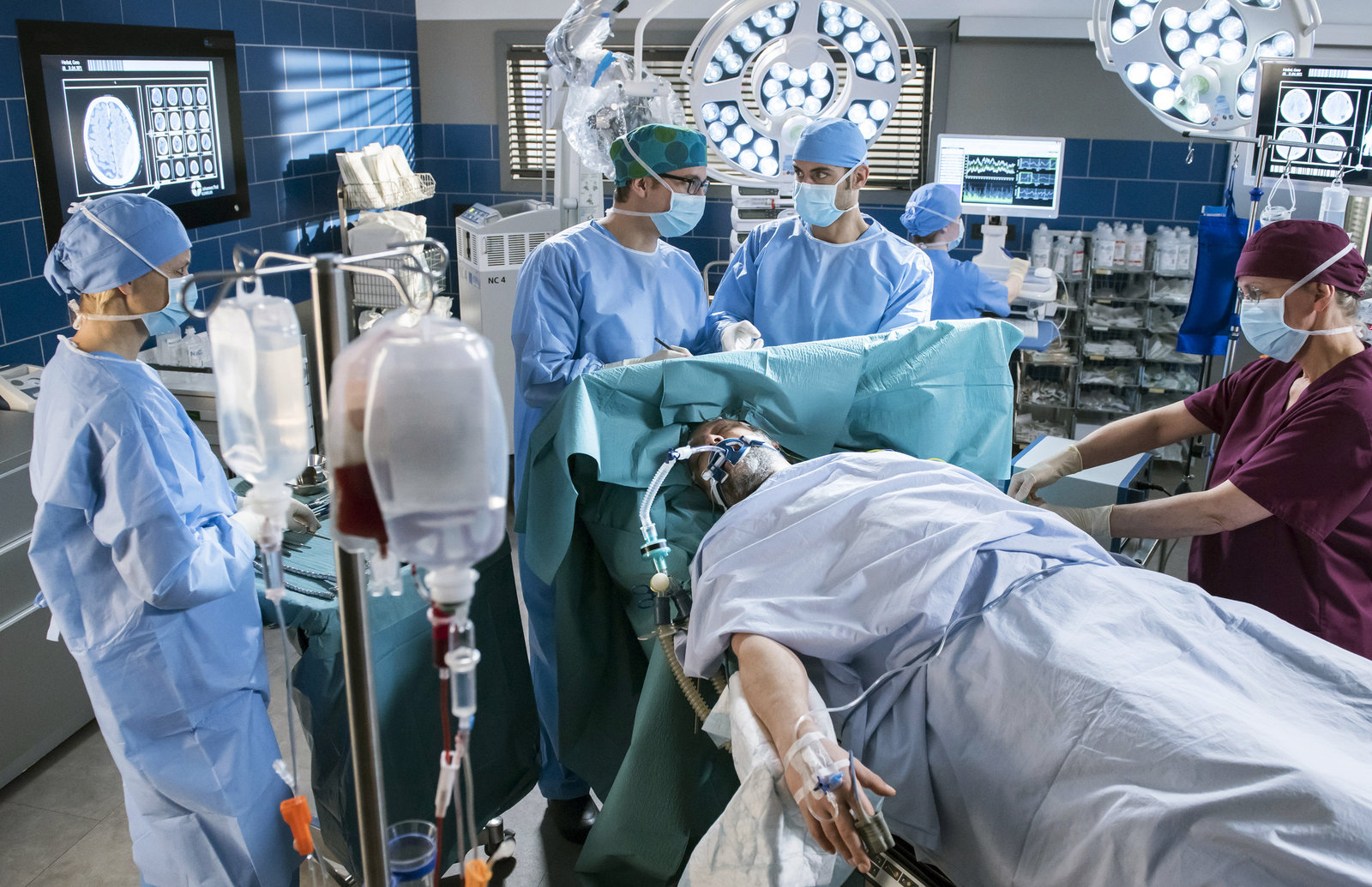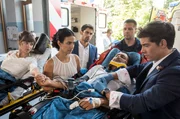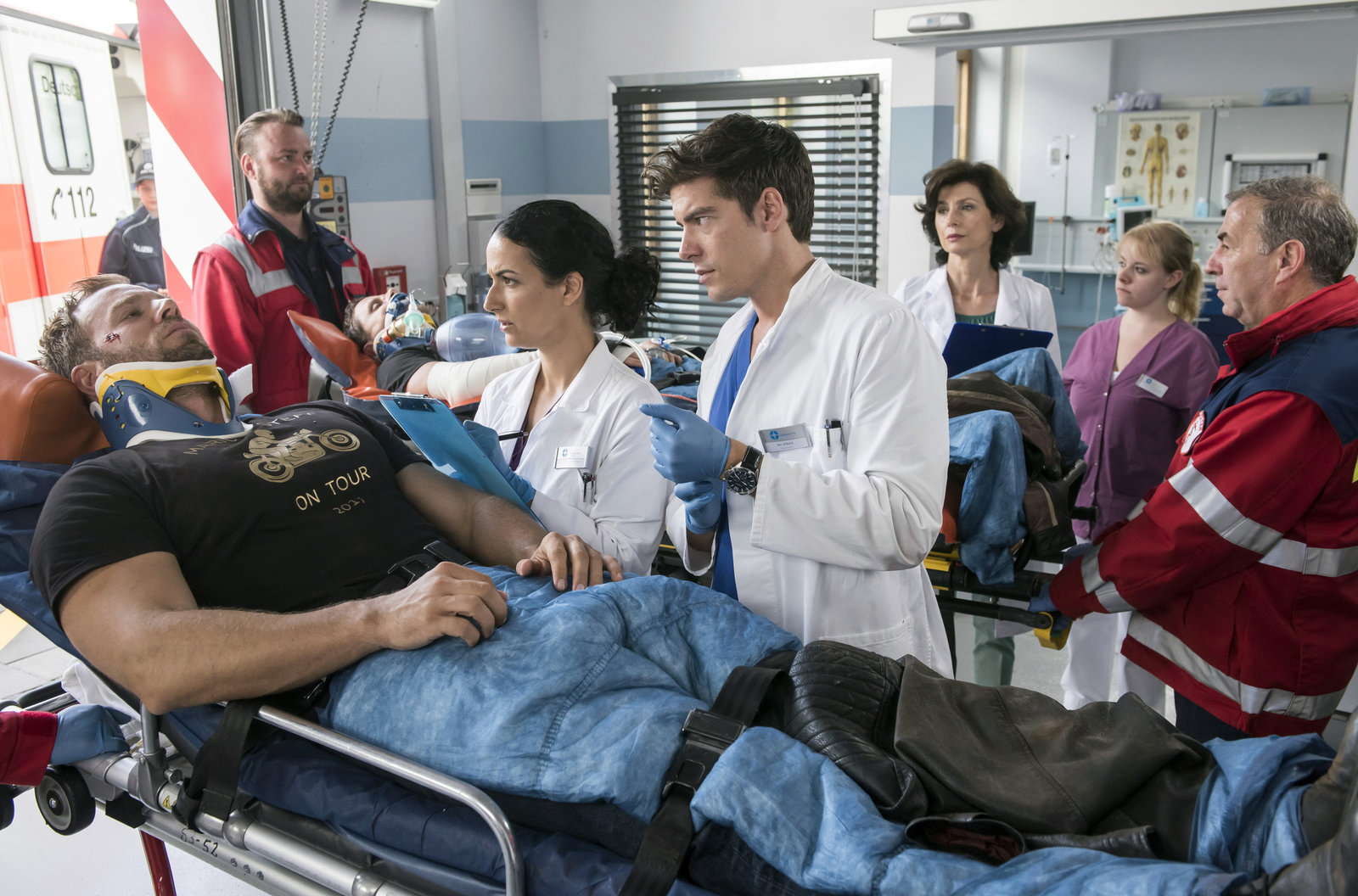 EntscheidungsfragenSteffen Kestling (Dominic Boeer, l.) wird nach einem Motorradunfall zeitgleich mit seinem Freund Mario (Mathis Reinhardt, 3.v.l. mit Komparse) ins JTL eingeliefert. Dr. Leyla Sherbaz (Sanam Afrashteh, 4.v.l.), Ben Ahlbeck (Philipp Danne, 3.v.l.) und Prof. Karin Patzelt (Marijam Agischewa, 3.v.r. mit Komparsen) nehmen die beiden Männer auf.Bild: © ARD/Jens Ulrich Koch