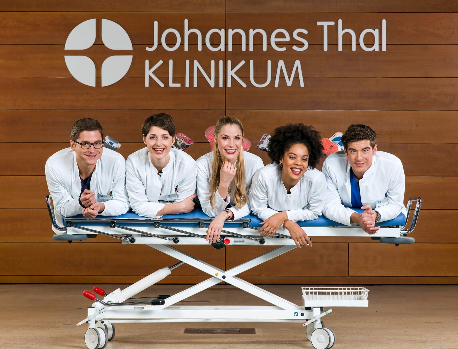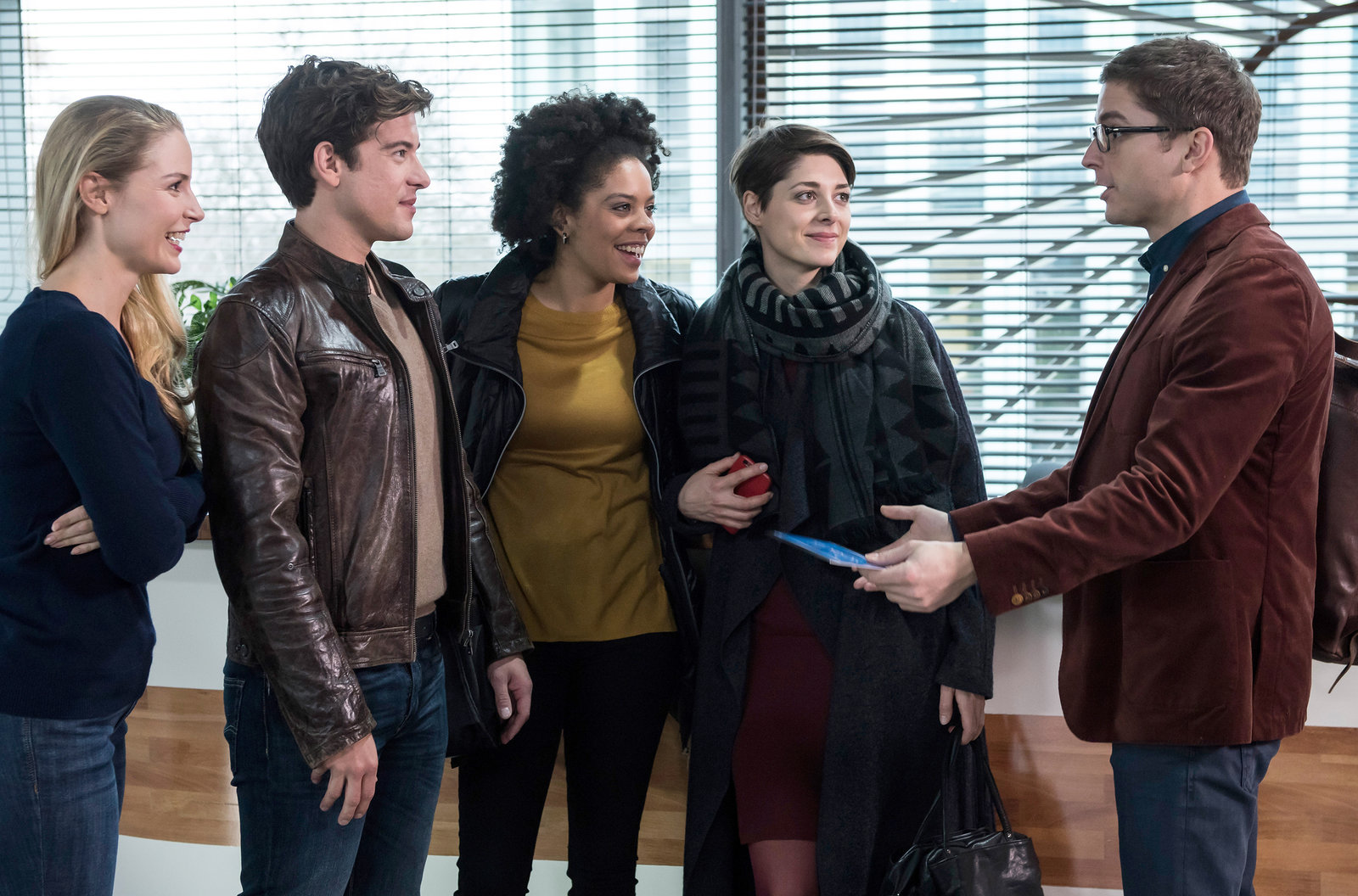 KlartextDie jungen Ärzte Julia Berger (Mirka Pigulla, l.), Ben Ahlbeck (Philipp Danne, 2.v.l.), Vivienne Kling (Jane Chirwa, 3.v.l.) und Dr. Theresa Koshka (Katharina Nesytowa, 2.v.r.) freuen sich für Elias (Stefan Ruppe, r.). Seine Doktorarbeit ist fertig zum Drucken.Bild: © ARD/Jens Ulrich Koch