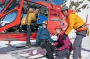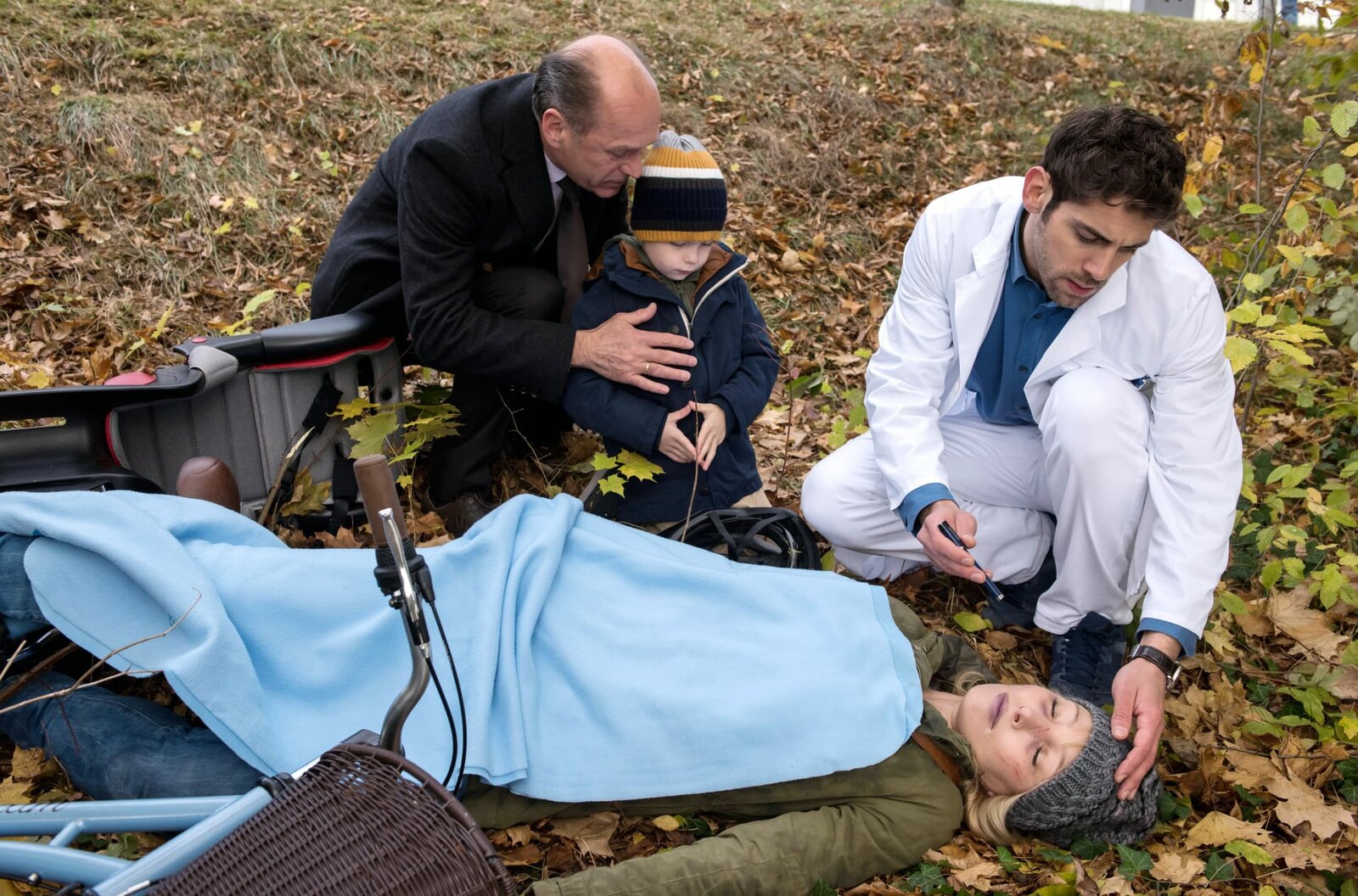 SchattensprüngeDurch Zufall entdecken Wolfgang Berger (Horst Günter Marx, l.) und Dr. Niklas Ahrend (Roy Peter Link, r.) den kleinen Luis (Josh Weidemann, 2.v.l.) und dessen bewusstlose Mutter Kathleen Bahr (Wencke Werner, r.).Bild: © NDR/ARD/Jens Ulrich Koch