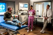 AusgleichJoachim Gerbert (Christian Kerepeszki, l.) kommt mit Bauchschmerzen ins Johannes-Thal-Klinikum. Er möchte dringend untersucht werden, auch wenn seine Ärzte Emma Jahn (Elisa Agbaglah, 2.v.r.) und Marc Lindner (Christian Beermann, r.) den Fall als weniger dringlich erachten.Bild: © ARD/Jens-Ulrich Koch