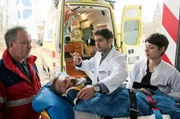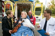 Mit letzter KraftDr. Elias Bähr (Stefan Ruppe, r.) nimmt den Instrumentenbauer Hartmut Hoffmann (Andreas Leupold, M. mit Komparse, h.) im Johannes-Thal-Klinikum auf. Er ist in Begleitung seines Sohnes Lenny (Manuel Zschunke, l.).Bild: © NDR/ARD/Jens Ulrich Koch
