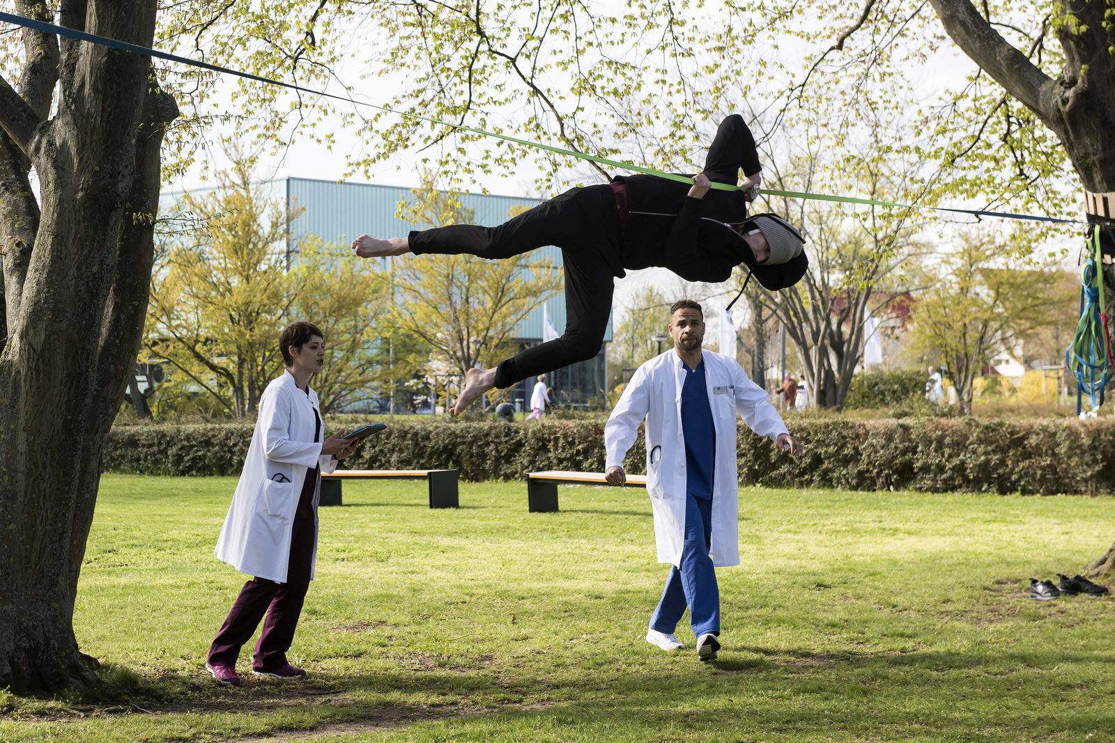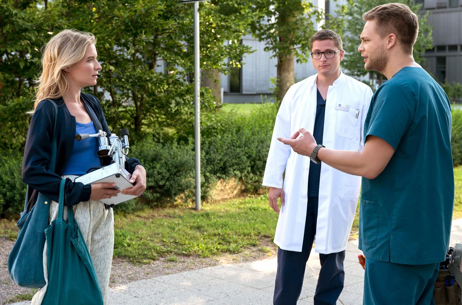 GrenzenDr. Sherbaz (Sanam Afrashteh, r.) ist erstaunt, als Dr. Niklas Ahrend (Roy Peter Link, l.) seinen Kollegen Dr. Moreau (Mike Adler, M.) um Hilfe bittet.Bild: © HR/ARD/Tom Schulze