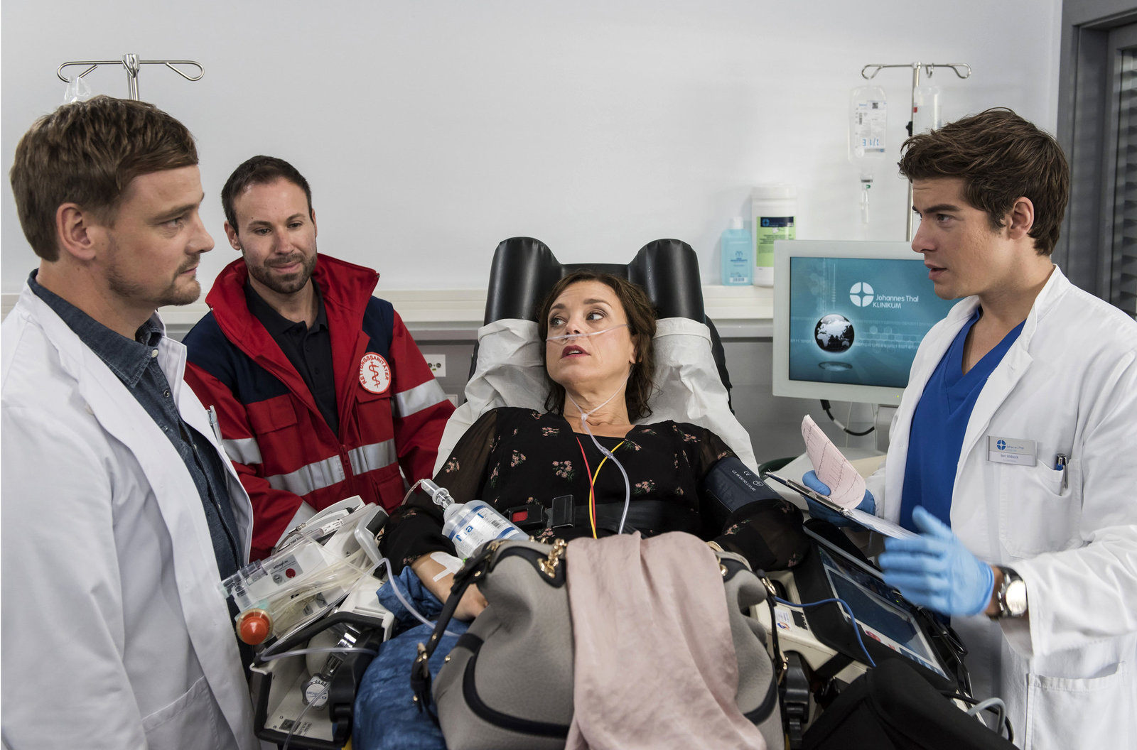 KämpfeDie Besitzerin eines Fitnessstudios, Katja Becker (Dominique Chiout, 2.v.r.) wird ins Johannes-Thal-Klinikum gebracht. Die Ärzte Dr. Marc Lindner (Christian Beermann, l.) und Ben Ahlbeck (Philipp Danne, r.) diagnostizieren einen Herzinfarkt (mit Komparse, 2.v.l.).Bild: © MDR/Jens Ulrich Koch