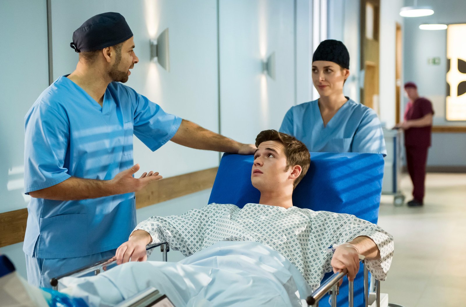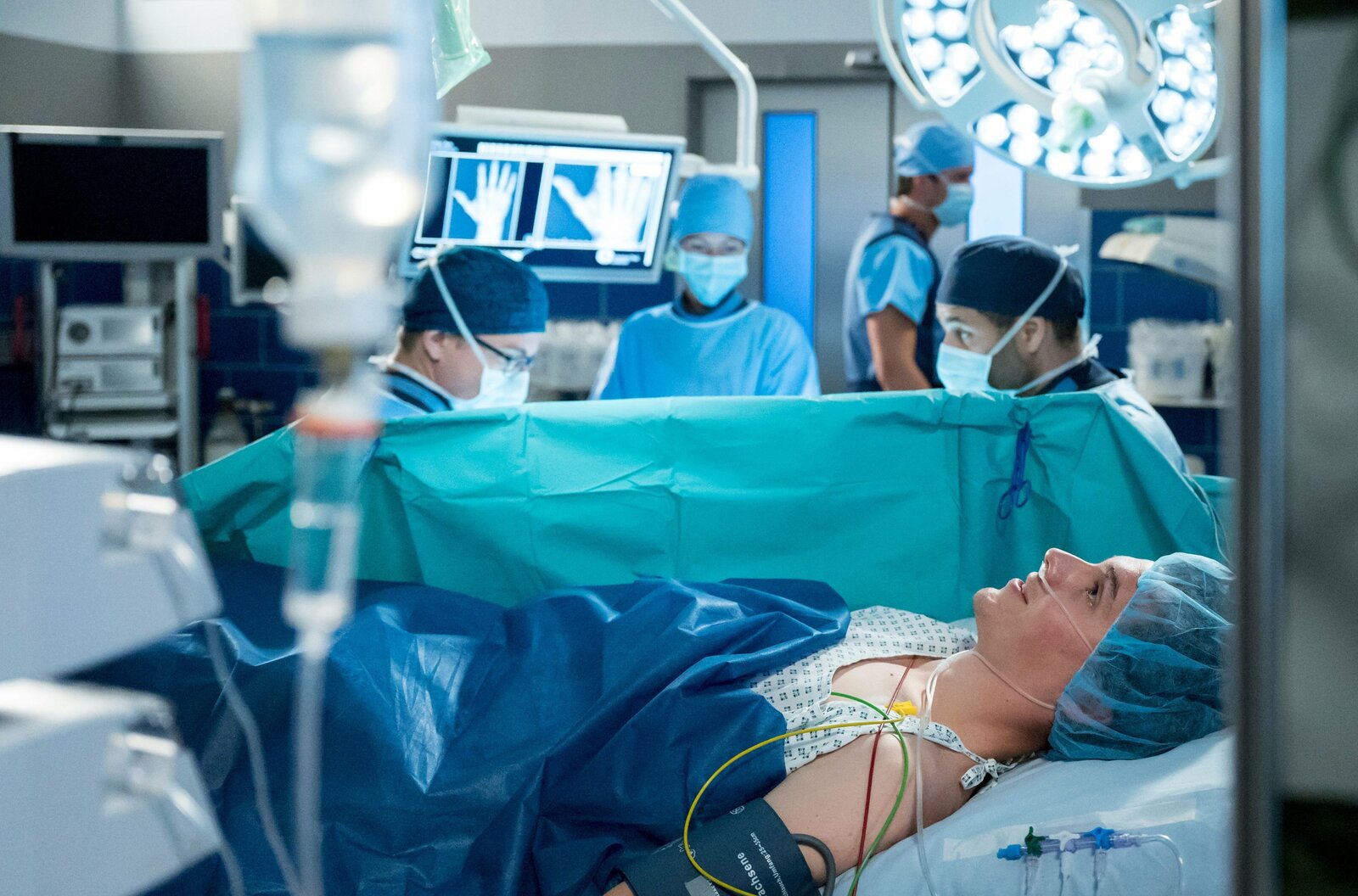 Sturz ins LeereDer werdende Vater Pius (Vincent Sauer, r.) landet im OP bei Matteo (Mike Adler, r.) und Elias (Stefan Ruppe, l. mit Komparsen, h.).Bild: © ARD/Jens Ulrich Koch