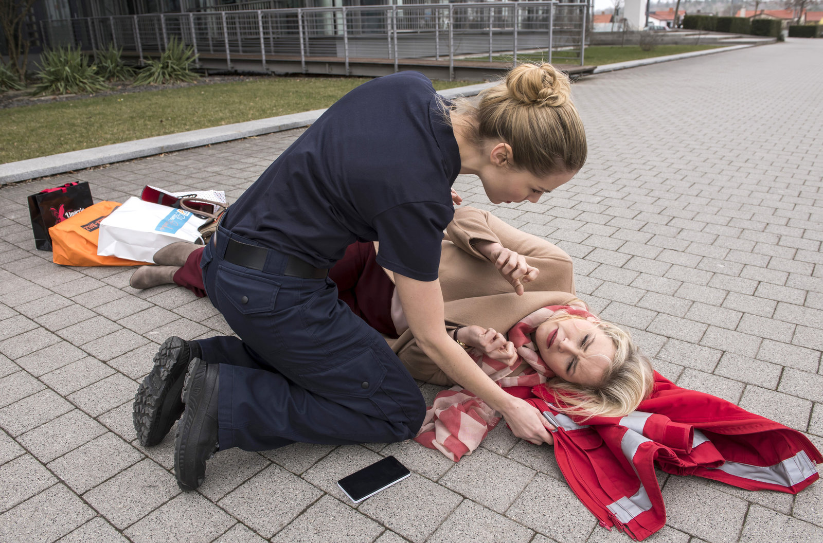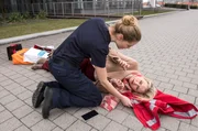 Nicht reden, sondern tunPlötzlich bekommt Lisa wieder Herzschmerzen. Elias ruft um Hilfe. V.l.n.r. Lisa Becker (Mira Elisa Goeres), Elias Bähr (Stefan Ruppe mit Komparsin)Bild: © MDR/Jens Ulrich Koch