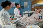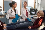 VerschwundenDie schwangere Ann-Sophie Marschall (Carlotta Truman, liegend) ist mit starken Schmerzen ins Klinikum gekommen. Die Untersuchung der beiden Ärztinnen Dr. Leyla Sherbaz (Sanam Afrashteh, l.), Julia Berger (Mirka Pigulla, M) bringt eine erschütternde Nachricht mit sich.Bild: © ARD/Jens Ulrich Koch