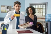 Helfen - oder lassen?Niklas (Roy Peter Link, l.) bekommt eine Pralinenschachtel "für den besten Schwiegersohn" - von Moreau! Dr. Leyla Sherbaz (Sanam Afrashteh, r.) findet es amüsant.Bild: © ARD/Jens Ulrich Koch