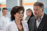 RückfälleProf. Karin Patzelt (Marijam Agischewa, l.) hat Angst vor dem Ergebnis der Nachsorgeuntersuchung. Dr. Heilmann (Thomas Rühmann, r.) spricht ihr Mut zu.Bild: © ARD/Jens Ulrich Koch