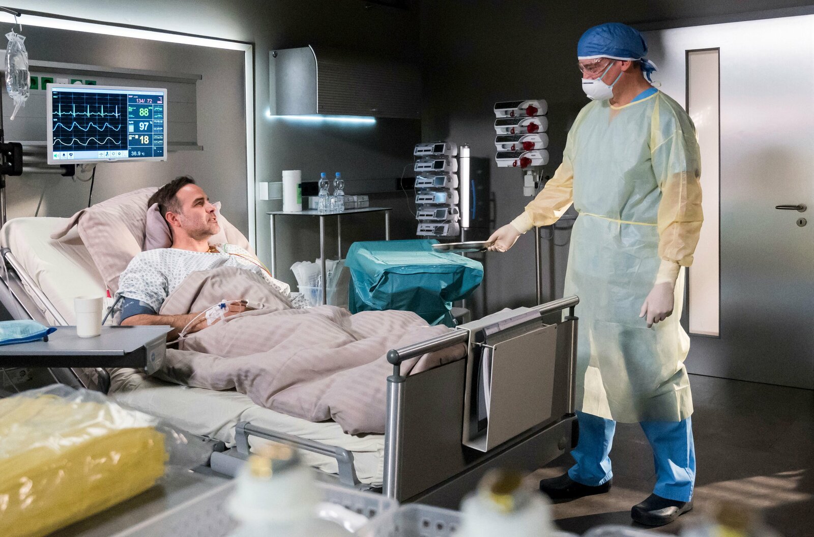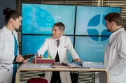 Der letzte TagDr. Moreau (Mike Adler, l.) lässt sich von Theresa (Katharina Nesytowa, r.) über die OP von Max Strehlow (Henry Horn, M.) aufklären.Bild: © ARD/Jens Ulrich Koch