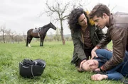 LiebeslügenWährend ihres Picknicks werden Leyla (Sanam Afrashteh, l.) und Ben (Philipp Danne, r.) Zeugen eines Reitunfalls. Gesine Pfahl (Julia Jäger, M.) liegt beuwsstlos am Boden.Bild: © MDR/Jens Ulrich Koch