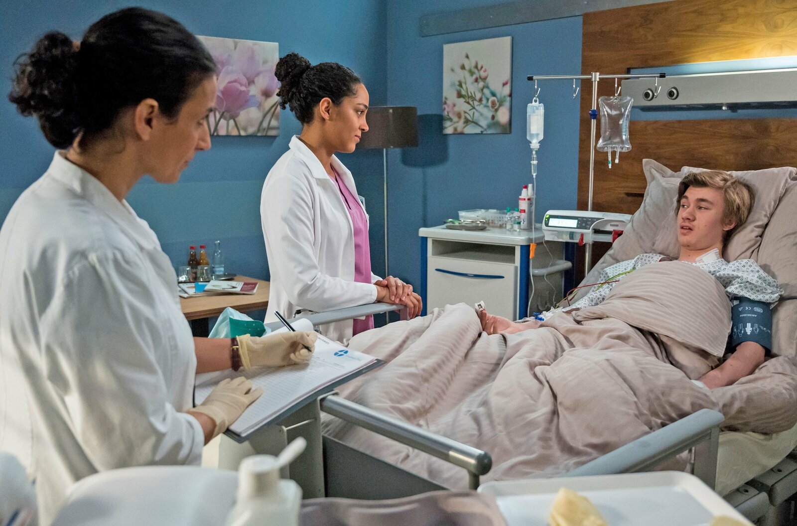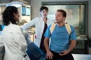 Menschliche MakelHannes Dorn (Alessandro Schuster, r.) hatte eine unschöne Begegnung mit einer Stichsäge. Nach der OP untersuchen ihn die beiden Ärztinnen Leyla Sherbaz (Sanam Afrashteh, l.) und Emma Jahn (Elisa Agbaglah, M.).Bild: © ARD/Jens Ulrich Koch