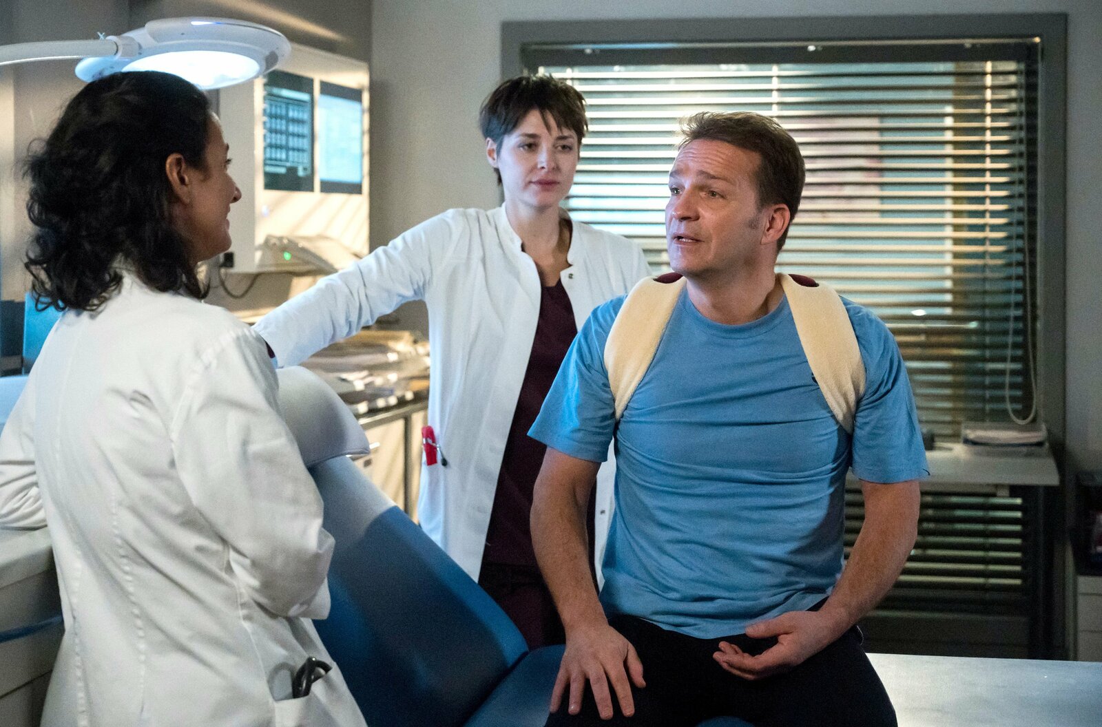 Der NeuePeer Nürtinger (Mathias Hermann, r.) wird von Leyla (Sanam Afrashteh, l.) und Theresa (Katharina Nesytowa, M.) im Behandlungsraum untersucht. Er klagt über Schmerzen in der Schulter.Bild: © MDR/ARD/Jens Ulrich Koch