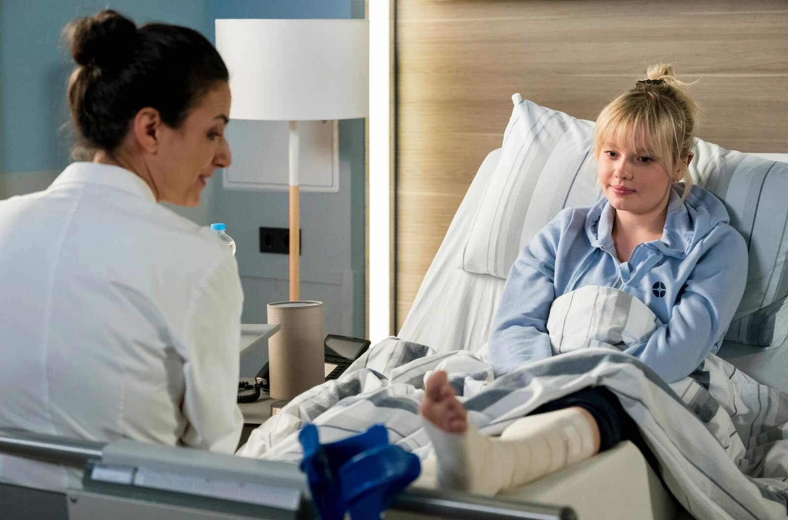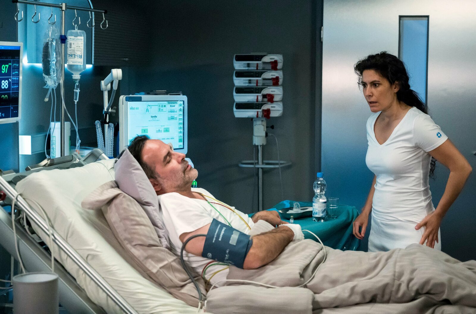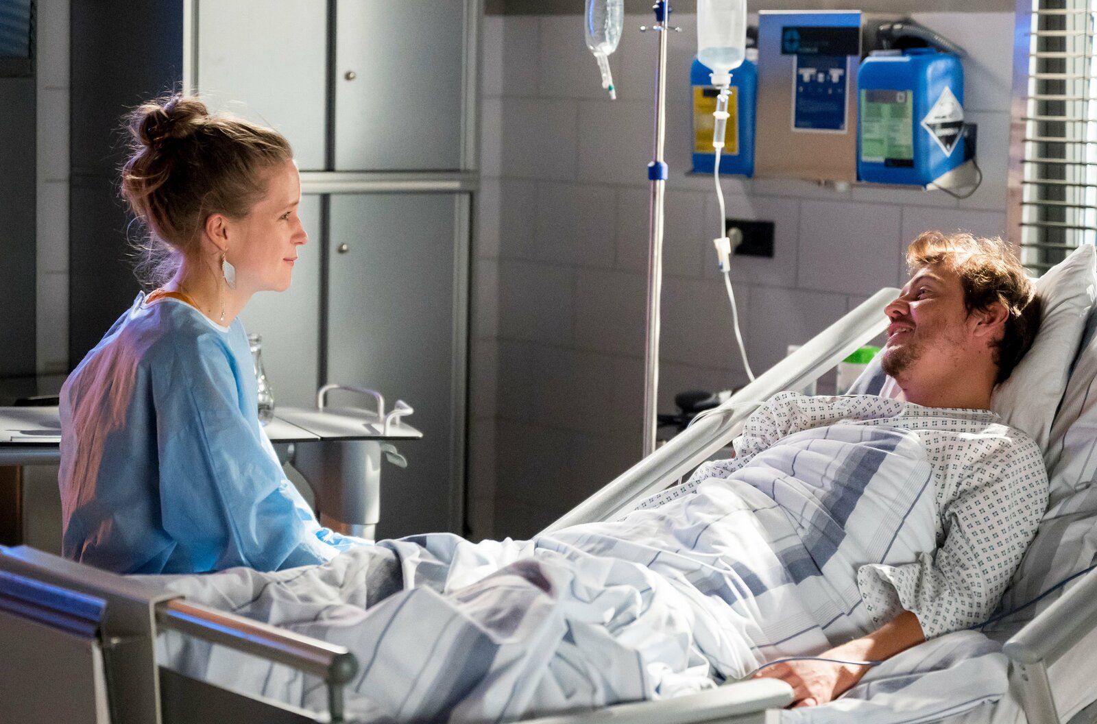 EndspurtDr. Matteo Moreau (Mike Adler, r.) betreut die Patientin Celina Sommer (Marie Luise Stahl, l.), die sich bei einem Sturz durch ein Hausdach schwer verletzt hat.Bild: © ARD/Jens Ulrich Koch