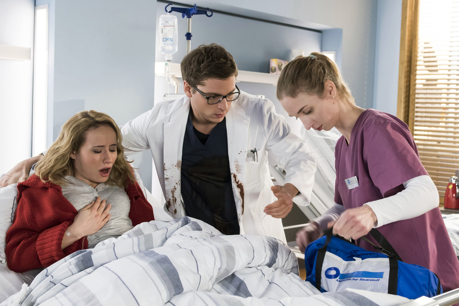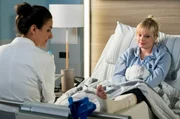 ZwickmühleDie Immobilienmaklerin Mareike Gessler ist eigentlich im Klinikum, um Julia zu treffen. Sie bekommt plötzlich Nasenbluten. V.l.n.r. Mareike Gessler (Judith Sehrbrock), Julia Berger (Mirka Pigulla), Rebecca Krieger (Milena Straube)Bild: © ARD/Jens Ulrich Koch