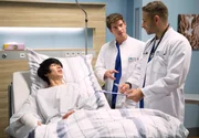 Menschliche MakelWährend der Untersuchung von Ramona Zergiebel (Camilla Renschke, l.) wetteifern die beiden Ärzte Mikko Rantala (Luan Gummich, M.) und Matteo Moreau (Mike Adler, r.)Bild: © MDR/ARD/Jens Ulrich Koch