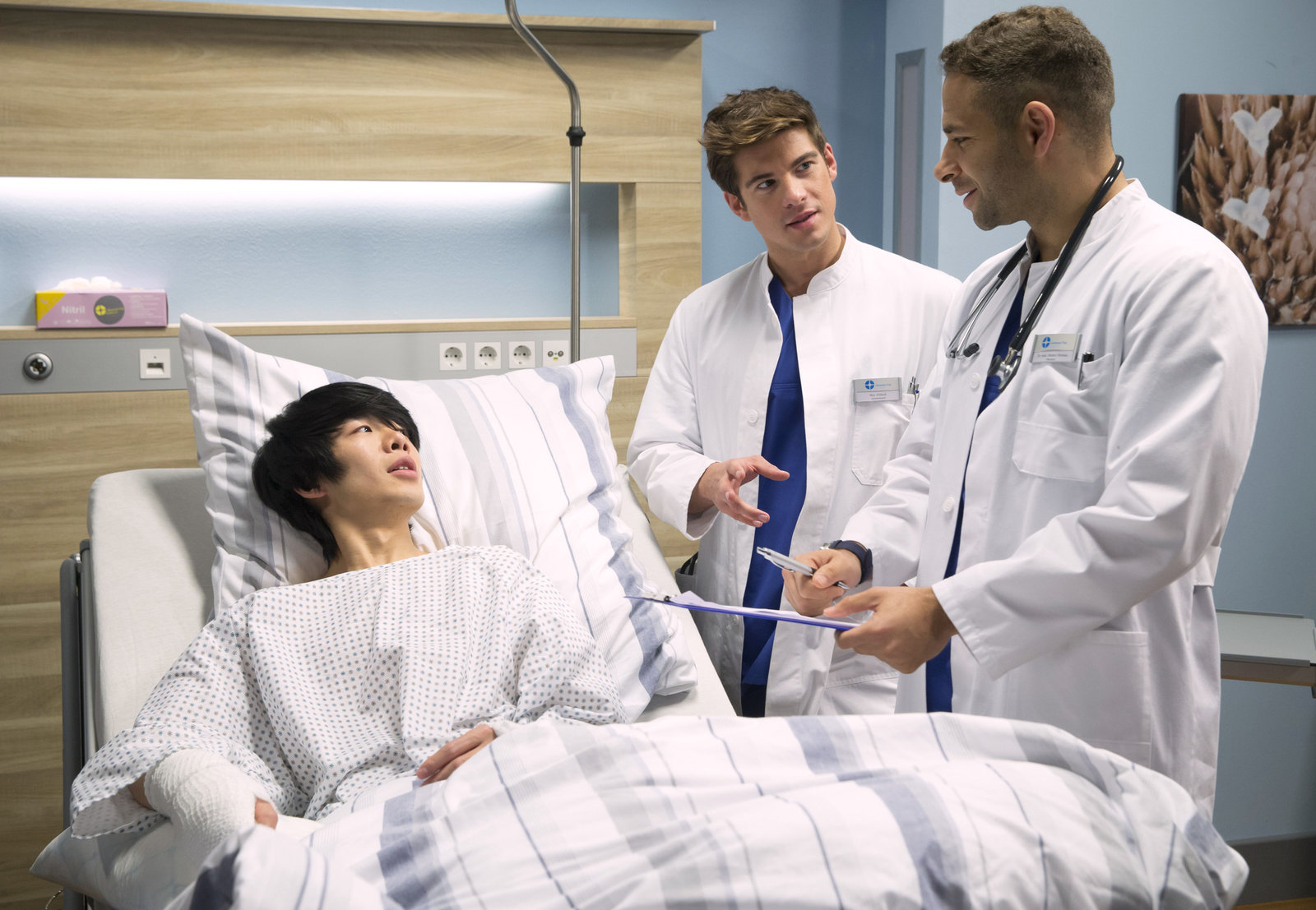 Schein oder SeinBen Ahlbeck (Philipp Danne, M.) zieht Dr. Matteo Moreau (Mike Adler, r.) zurate, um Thien Pans (Yung Ngo, l.) ungewöhnliche Blutwerte zu behandeln.Bild: © HR/ARD/Tom Schulze
