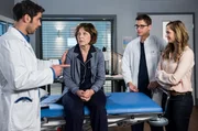 Auf DistanzDr. Lea Peters (Anja Nejarri, l.) aus der Sachsenklinik, Ben Ahlbeck (Philipp Danne, 2.v.l.), Elias Bähr (Stefan Ruppe, 2.v.r.) und Prof. Dr. Karin Patzelt (Marijam Agischewa, r.) besprechen gemeinsam die Werte des Patienten Jost Helmer.Bild: © ARD/Jens Ulrich Koch