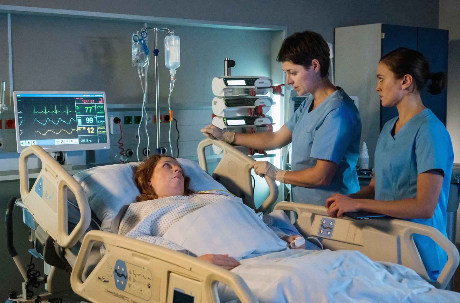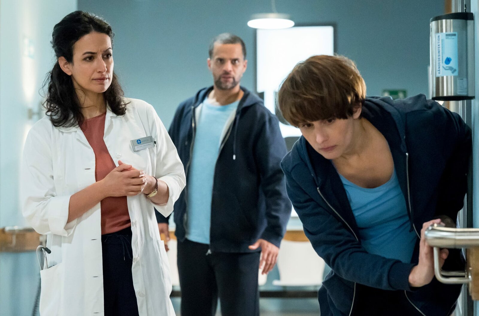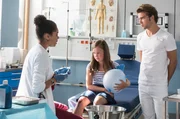 FreigeschwommenLuna Schneider (Leonie Brandis, r.) hält sich nicht an die Bettruhe. Ihr Partner Kai Matzke (Philip Bender) und Dr. Leyla Sherbaz (Sanam Afrashteh, l.) sind besorgt.Bild: © ARD/Jens Ulrich Koch